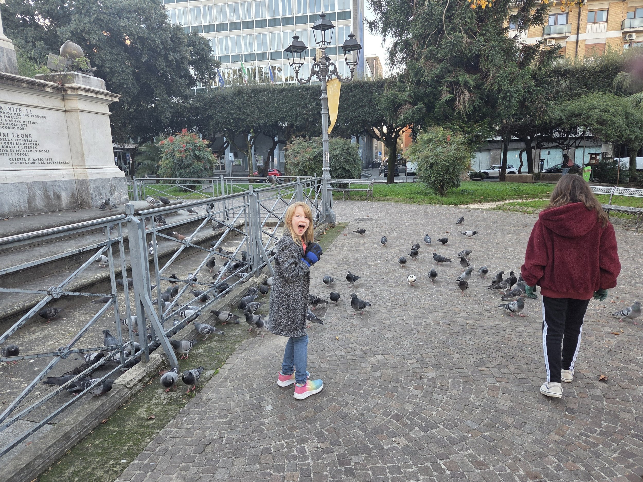 Playing with the pigeons on our way in to the Questura.
